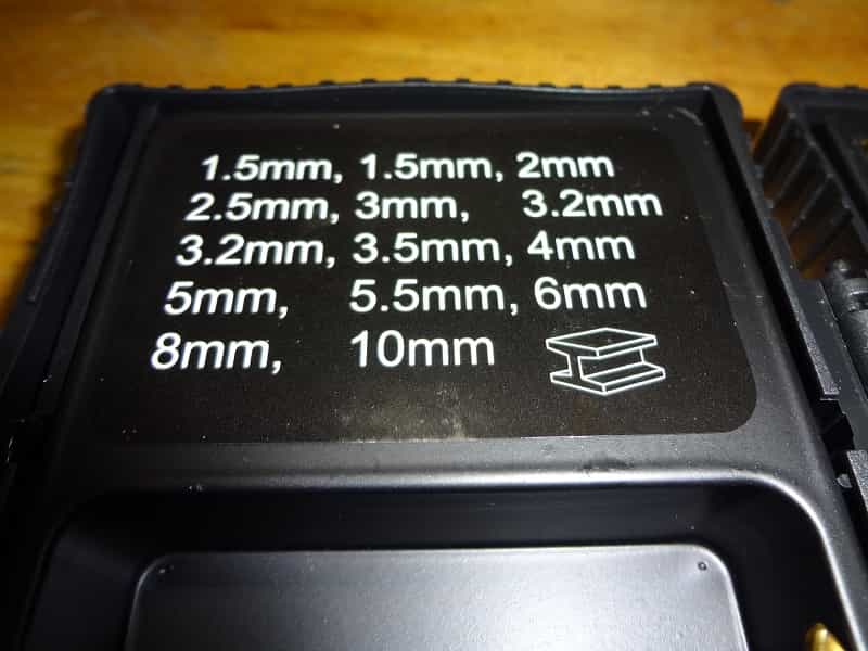 1.5mm, 1.5mm, 2mm, 2.5mm, 3mm,3.2mm, 3.2mm, 3.5mm, 4mm, 5mm, 5.5mm, 6mm, 8mm, 10mm